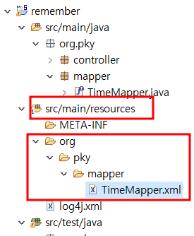 1) src/main/resources 경로에 org/pky/mapper 경로가 되도록 폴더를 생성하고, TimeMapper 인터페이스와 이름이 동일한 TimeMapper.xml 파일을 생성한다.