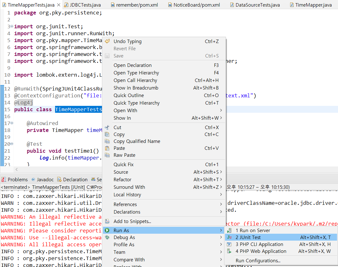 2) SQL문 작동 테스트를 위해 TimeMapperTests 테스트 클래스 생성