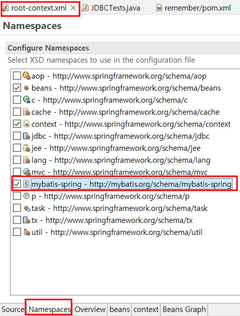 - 하단 namespaces를 클릭 후 mybatis-spring 체크