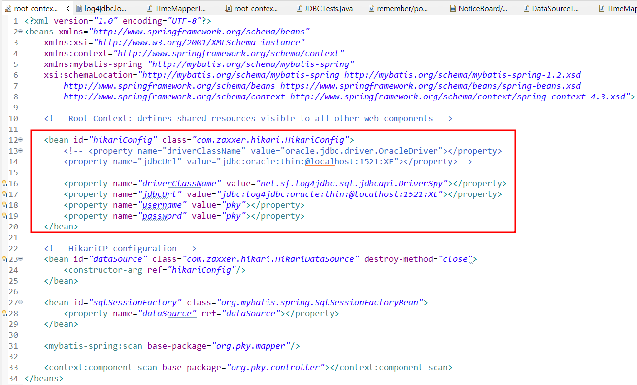 - driverClassName 값을 "net.sf.log4jdbc.sql.jdbcapi.DriverSpy"로 변경해준다.