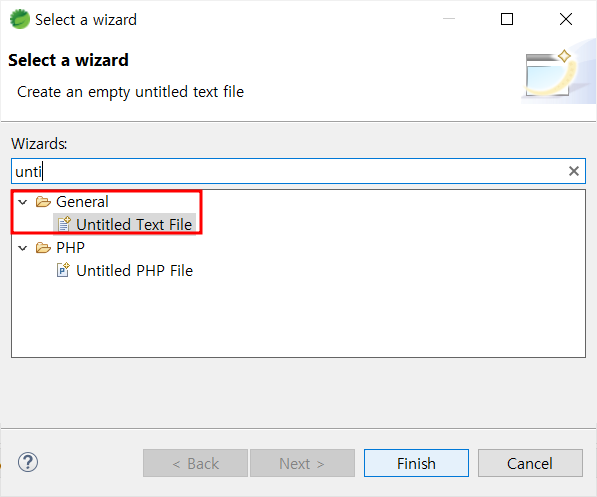 - 검색창에 untitled 검색 >> Untitled Text File 클릭 >> Finish