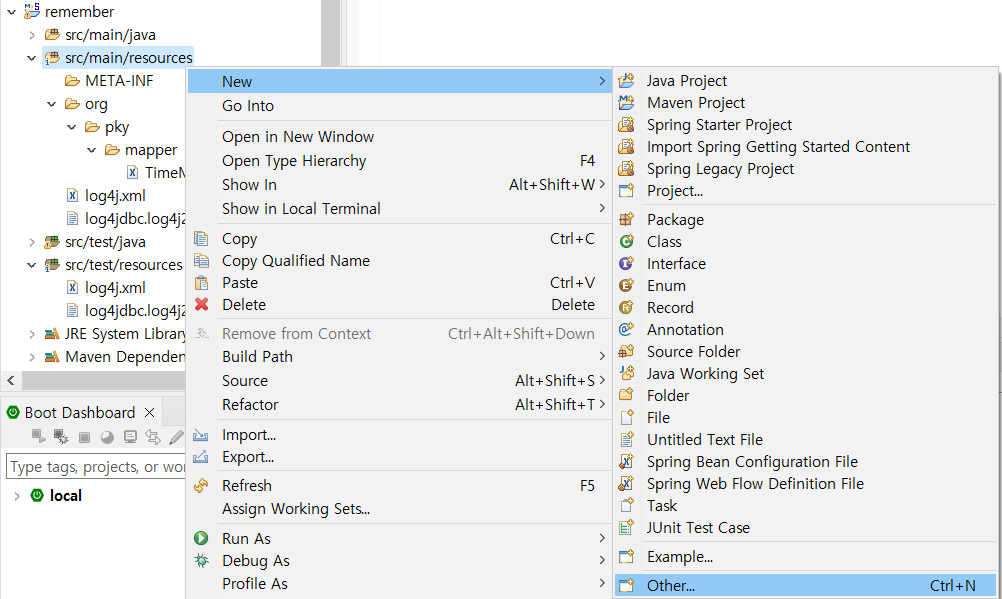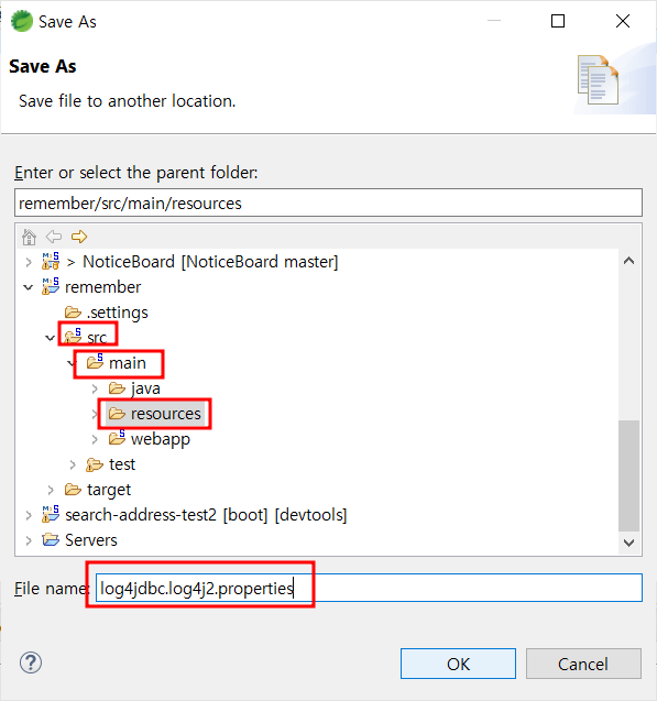 - src >> main >> resources 순으로 클릭 후, File name을 log4jdbc.log4j2.properties 로 설정한다.
